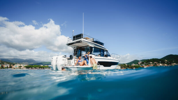 There’s a pronounced step up to the helm area, to ensure plentiful headroom in the owner’s cabin below, but this will also help provide a clear view ahead from the four forward facing seats.