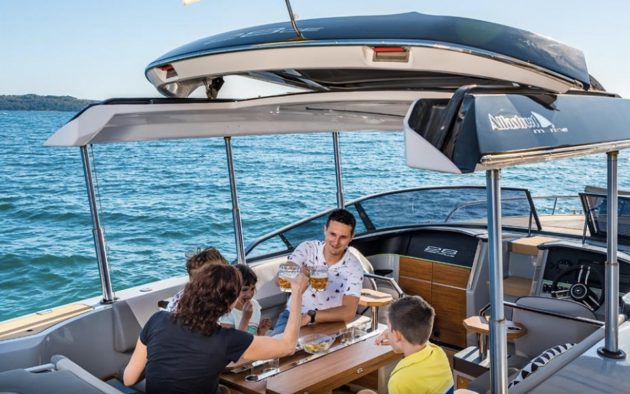 Once you’ve moored up, you can also seal the boat off from the elements at the touch of a button – this does away with the chore of putting up canvas covers and protects the woodwork and upholstery from UV damage.