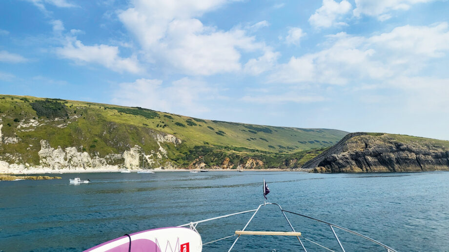 After 90 mins chugging, we arrived at Durdle Door with the usual procession of visitors descending down to its stony beach. We motored slowly past and poked our nose into Lulworth Cove. I’ve always been wary of anchoring here after being spooked many years ago by katabatic winds dragging our anchor at 2am, almost hitting the adjacent boats!