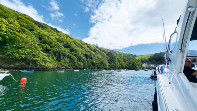 On a mooring buoy in the Helford – not far in the water taxi to the Ferryboat Inn