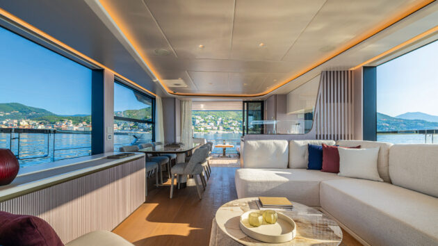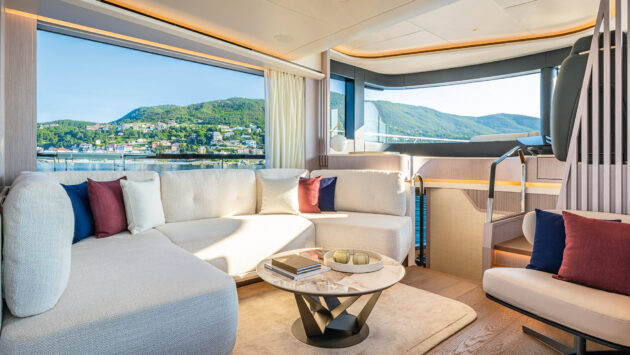 Those computer-controlled vectoring pods really come into their own in the marina. With a simple twist or push of the joystick, you can manoeuvre it into a berth like a seasoned pro. The ergonomics at both helm stations are perfectly good. You may want to try manually trimming the bow down from its usual three or four degrees attitude to improve visibility aft from the lower helm and avoid having to duck down to get a clear view of what’s behind or on your stern quarters.