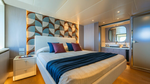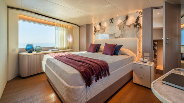 The raised foredeck and big forward hull windows make the owner’s bow cabin particularly pleasant