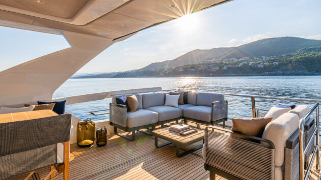 The flybridge’s aft end uses ‘Terrace Atmosphere’ freestanding deck furniture