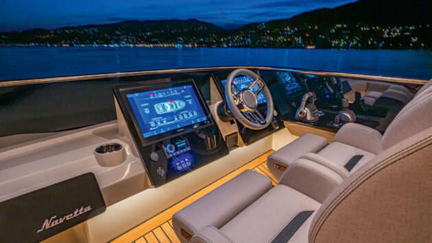 The outdoor deck spaces on Navettas are always good, and this one is no exception. The flybridge has three distinct zones. The forward two zones enjoy the shade from that substantial optional hardtop. Up front, there’s a C-sofa to port and a helm station to starboard, which is the first Navetta not to have it on the centreline.